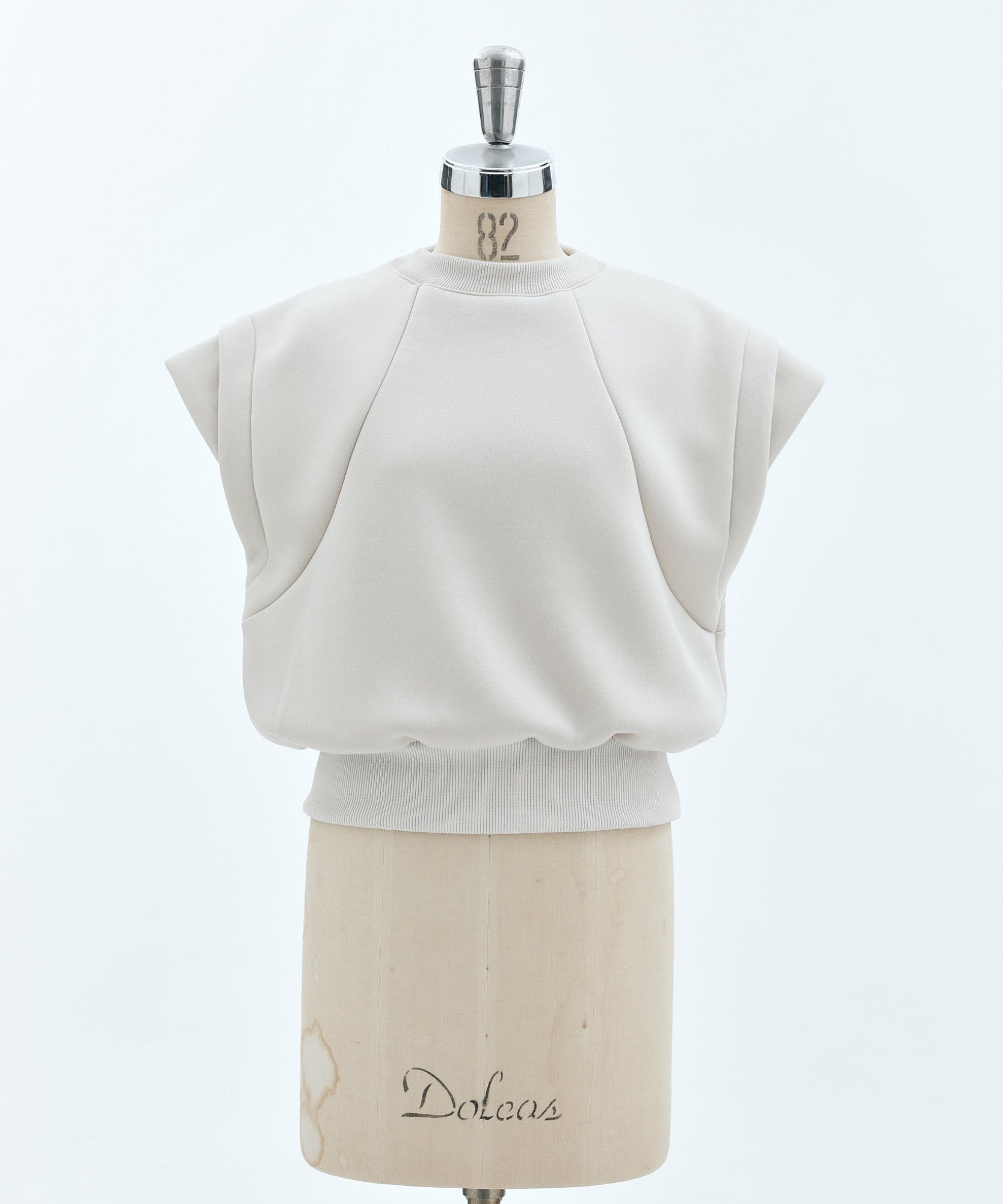 ウェストが程よく締まっていてバラ ンス良く着こなすことができるキャップスリーブトップス。 前後にシンデレララインが施していて、スッキリとした⾒え感もポイント。